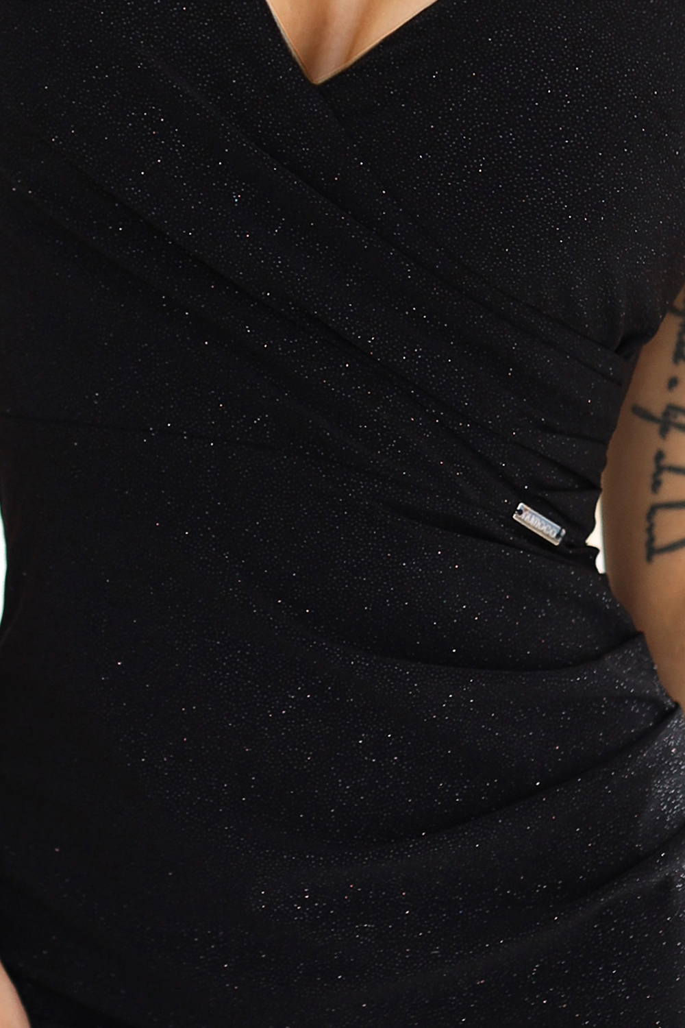 Dazzling in its simplicity, this black pencil dress with delicate glitter shimmer and fitted silhouette is a proposal for women who appreciate classic elegance and striking appearance. The model with wrap neckline on straps subtly emphasizes the figure and will be perfect for evening outings, parties or elegant dinners.