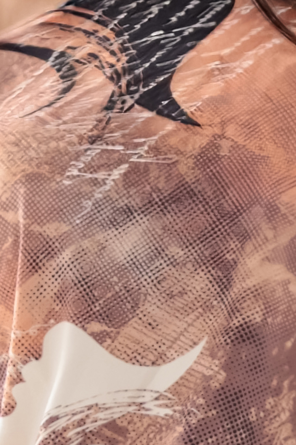 The pattern in shades of copper, beige and black gives the styling exceptional character. The boat neckline can also be worn sensually dropped on one shoulder. The model has 3/4 sleeves and practical pockets. Perfect for both daily meetings and evening outings.
