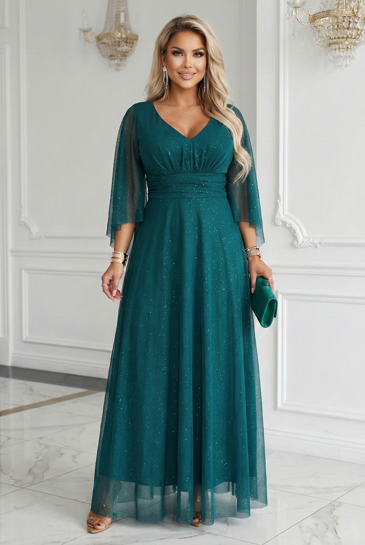 655-2 A long, shimmering dress with a plunging neckline and sheer sleeves - emerald green