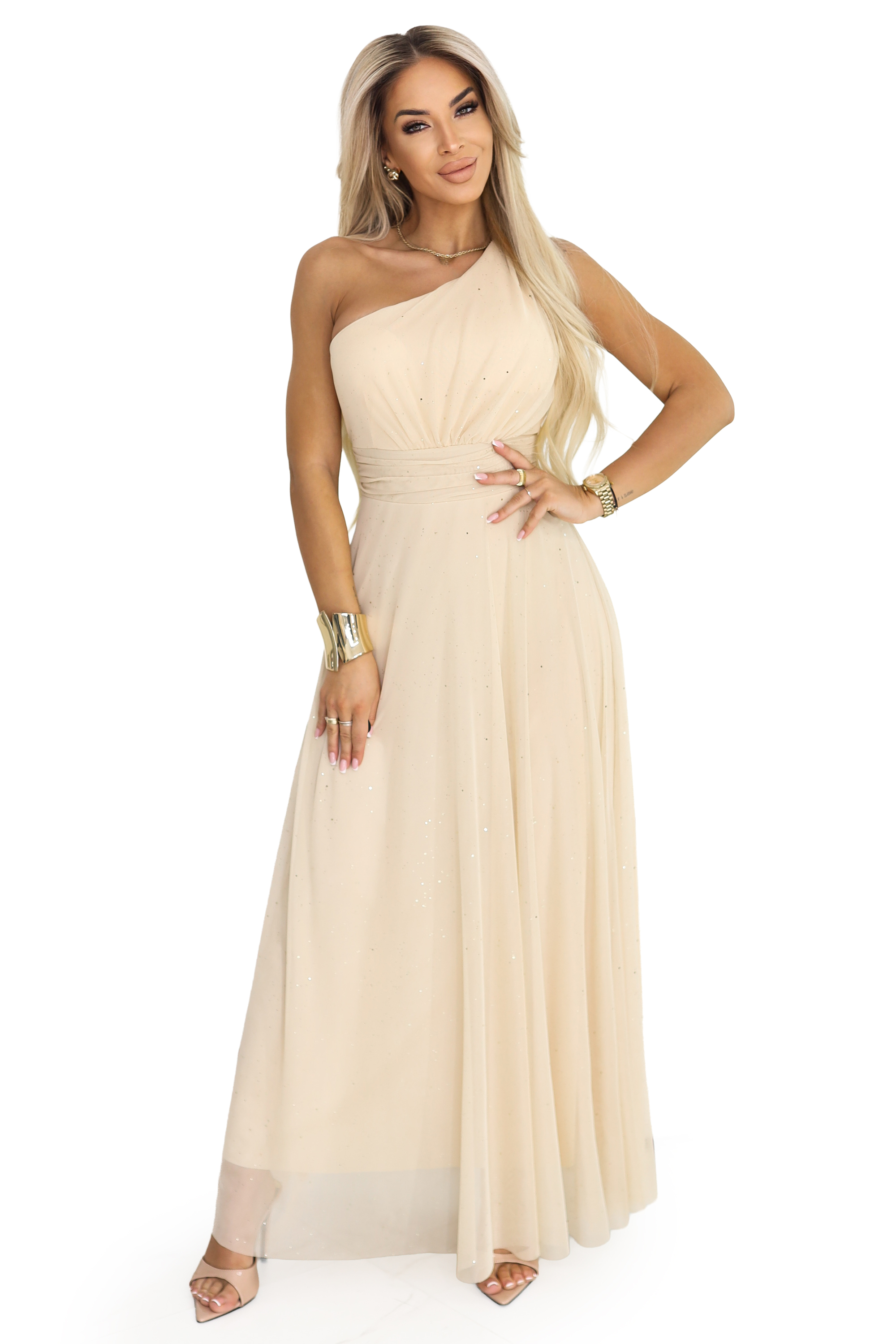 656-2 Long, sparkling, one-shoulder evening dress - champagne beige